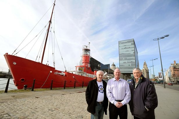 The Mersey Bar Lightship,berthed at Canning Dock,on the Strand, plan to celebrate the 50th Anniversary of Radio Caroline with a months broadcast. Alan Roberts (Mersey Bar Lightship owner) centre,with John Dwyer (Project Manager) left &Terry Lennaine (DJ). Pic Andrew Teebay.
